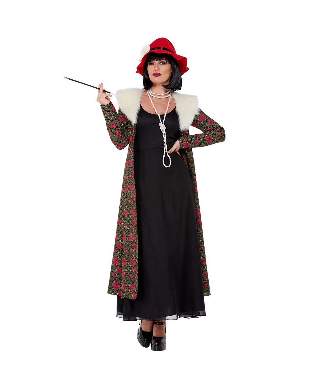 Unser 20s Ganoven Braut Kostümmantel für Erwachsene präsentiert sich mit rotem Blumen-Allover-Print. Ein weißer Kunstfell-Kragen verleiht deinem Mantel eine mondäne Note und lässt dich wie eine Diva aussehen. Abgerundet wird dein Ganoven Lady-Kostüm mit einem roten Hut, an dem sich ein schwarzes Hutband und eine große weiße Blume befinden. Trage hierzu das wunderschöne Charleston Frauenkostüm mit Glitzer rot