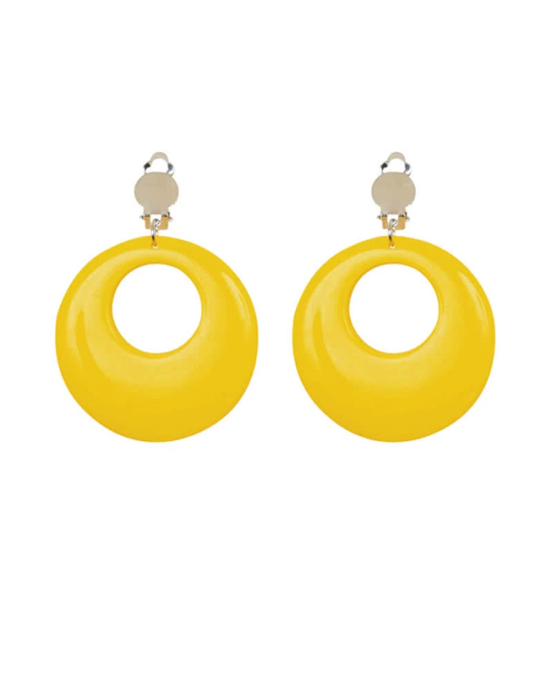 Bestelle Dir jetzt deine neongelben 80er Jahre Ohrringe aus farbigem Kunststoff und schmücke dich wie Madonna oder Cindy Lauper. Die Kunststoffohrringe haben einen Clips und werden damit einfach am Ohrläppchen befestigt.