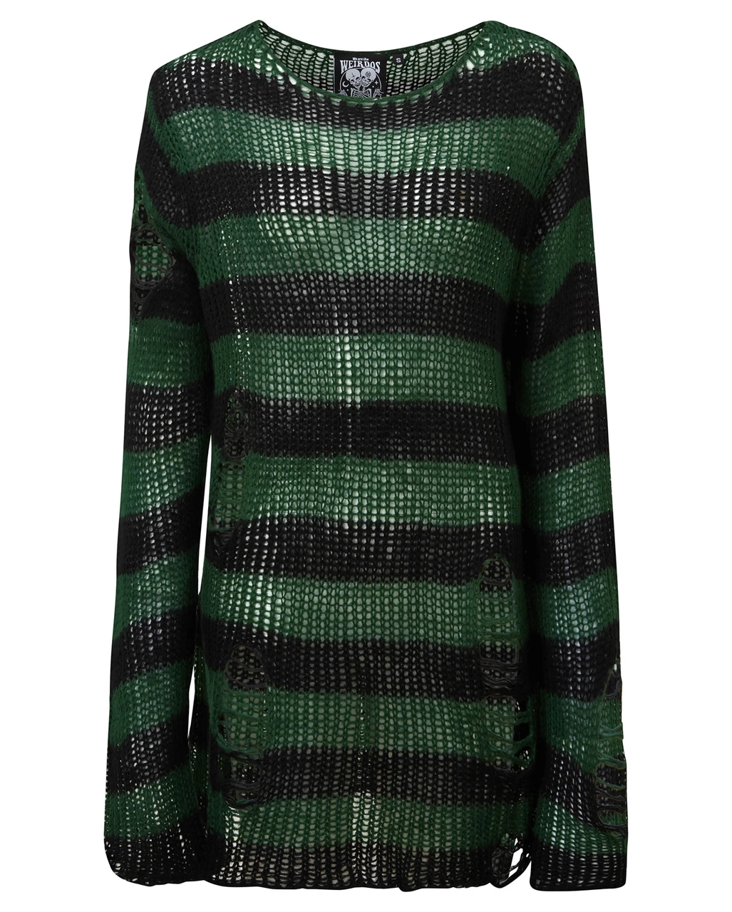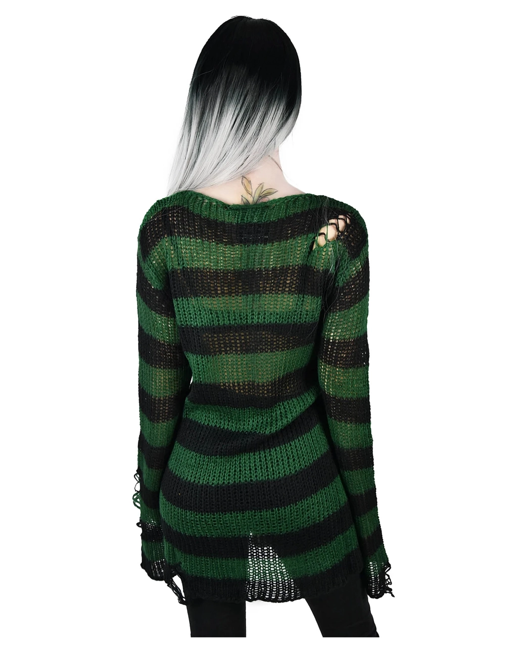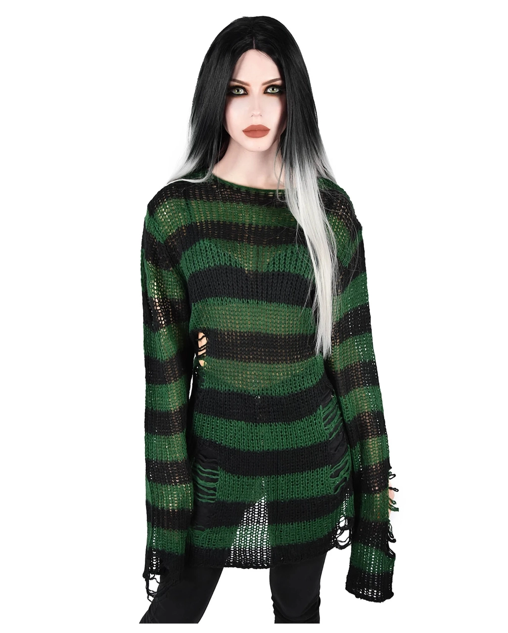 Der weiche Absinthe Strickpullover KILLSTAR erinnert an den Grunge der 90er Jahre und eignet sich perfekt zum Überziehen – oder zum Tragen als Einzelstück. Der Gothic Pulli ist schwarz und gedämpft grün gestreift, mit extra langer Länge für einen relaxten Look. Mit Distress-Details und tiefem Ausschnitt ist er ideal für Festivals, Mitternachtsspaziergänge mit dem Mond und verkatertes Sonntagsvergnügen. Kombiniere den KILLSTAR Absinthe Strickpullover mit schwarzen Leggings und einem eleganten Halsband für einen besonderes lässigen Look.