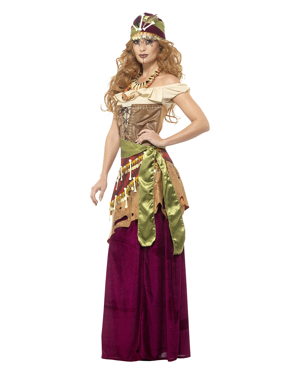 Das Afrikanische Voodoo Priesterin Kostüm besteht aus einem weinroten Kostümkleid mit beigefarbenen Oberteil samt Schnürung in Leder-Optik und weiteren Verzierungen wie Goldmünzen, Knochenteilen und einer Rüsche in Kunstleder-Optik. Dazu gesellen sich eine Kette mit gemusterten Holzperlen, eine zweite mit Knochenteilen sowie eine Kopftuch mit Kunstfedern und eine grüne Schärpe. Dazu passt die Voodoo Priesterin Perücke und für den Herren das Afrikanischer Voodoo Mann Kostüm Deluxe.