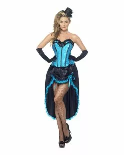 Die Burlesque Tänzerin Verkleidung überzeugt durch seinen seidenartigen Glanz der Corsage und Unterkleides. Die Ränder des schwarz gestreiften, himmelblauen Korsetts sind mit einem schwarzen Spitzenband versehen. Am unteren Rand befinden sich zwei schwarze Schleifen und eine am oberen Rand in der Mitte. Die Corsage kann mittels Hakenverschluss am Rücken in drei Stufen geschlossen werden. Der schwarze Rock wird am Saum von einem blauen Band geschmückt. Er ist vorne kürzer als hinten geschnitten. Die Burlesque Tänzerin Verkleidung ist nicht die einzige ihrer Art in unserem Sortiment, auch ein Burlesque Vampiress Kostüm gehört dazu. Als passendes Kostümzubehör empfehlen wir Halterlose Burlesque Nylonstrümpfe.