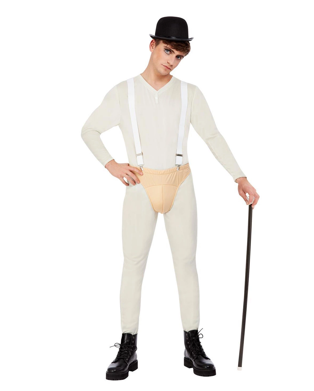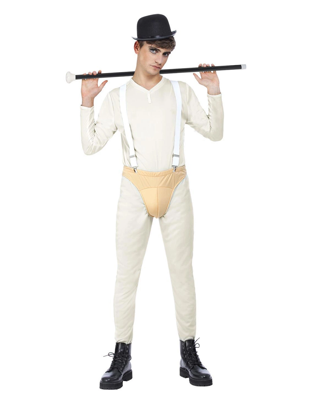Das Clockwork Terror Männerkostüm besticht durch seine abgedrehte Optik: Ein weißer Bodysuit der Halloween-Verkleidung als Einteiler sowie ein beiger Suspenser, der über dem Jumpsuit getragen und mittels Hosenträgern befestigt wird, lassen dich sofort wie ein Psychopath wirken. Eine schwarze Mütze rundet dein Halloween-Kostüm stimmig ab. Dazu passen Schwarze Wimpern für Ober- und Unterlid und ein Gehstock mit diamantförmigen Knauf.