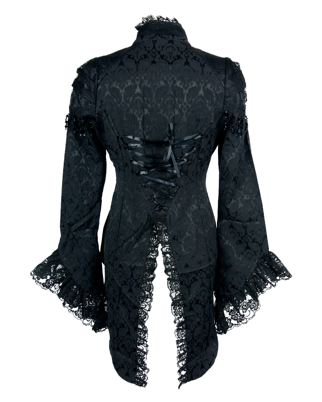 Mit einem solchen Damen Brokatfrack mit Spitze kannst du extravagante Gothic Outfits aufpeppen. Die gemusterte Frauenjacke im Gothic Look ist reich verziert und ein echter Hingucker auf Gothic Festivals, Fotoshootings und zu Halloween.