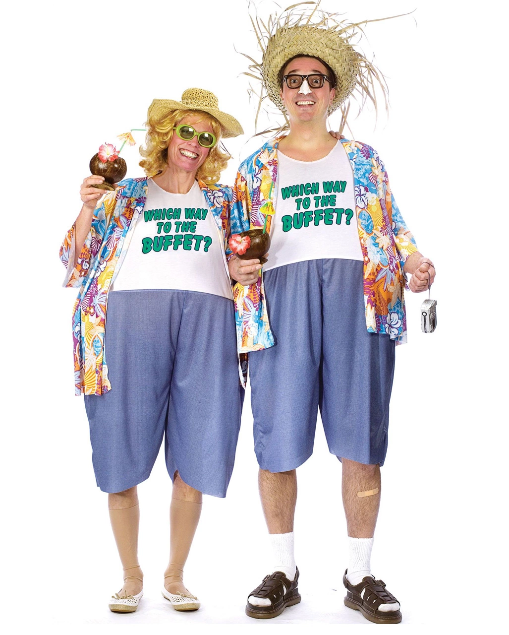Das Kostüm fetter Tourist besteht aus einem Overall aus zusammengenähter blauer Shorts und weißem T-Shirt sowie aus einem Hawaii Hemd. Das T-Shirt ist hinten mit einem kleinen Klettverschluss versehen, geöffnet bietet er einen ausreichenden Einstieg in das Kostüm, das mit einem Drahtreifen einen riesigen Bauchumfang simuliert. Das riesige Hawaii Hemd ist knopflos und muss daher offen getragen werden. Auf dem T-Shirt ist die Aufschrift „which way to the buffet?“ (wo geht’s zum Buffet?) zu lesen. Mit den Redneck Acryl Zähne, einem voll peinlichen MännerToupet blond und dem Echthaarbart Macker blond kannst Du deine Schreckensfigur vervollständigen.