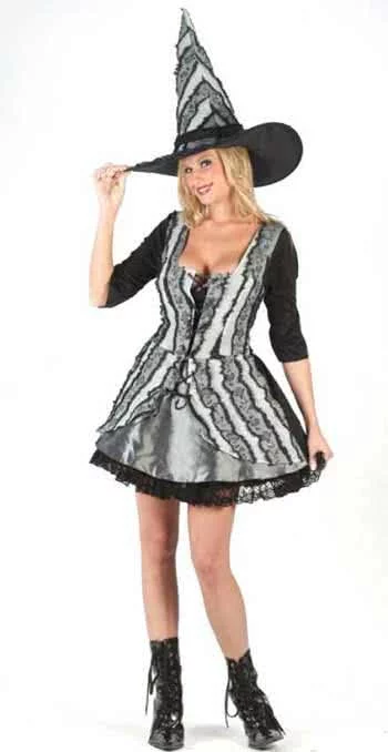 Schwarz-graues sexy Kostüm einer Gothic-Hexe. Das freche, kurze Kostüm mit leichten Trompetenärmeln kommt mit dazu passendem Hexenhut und ist der Hit auf jeder Halloween- oder Karnevalsparty.