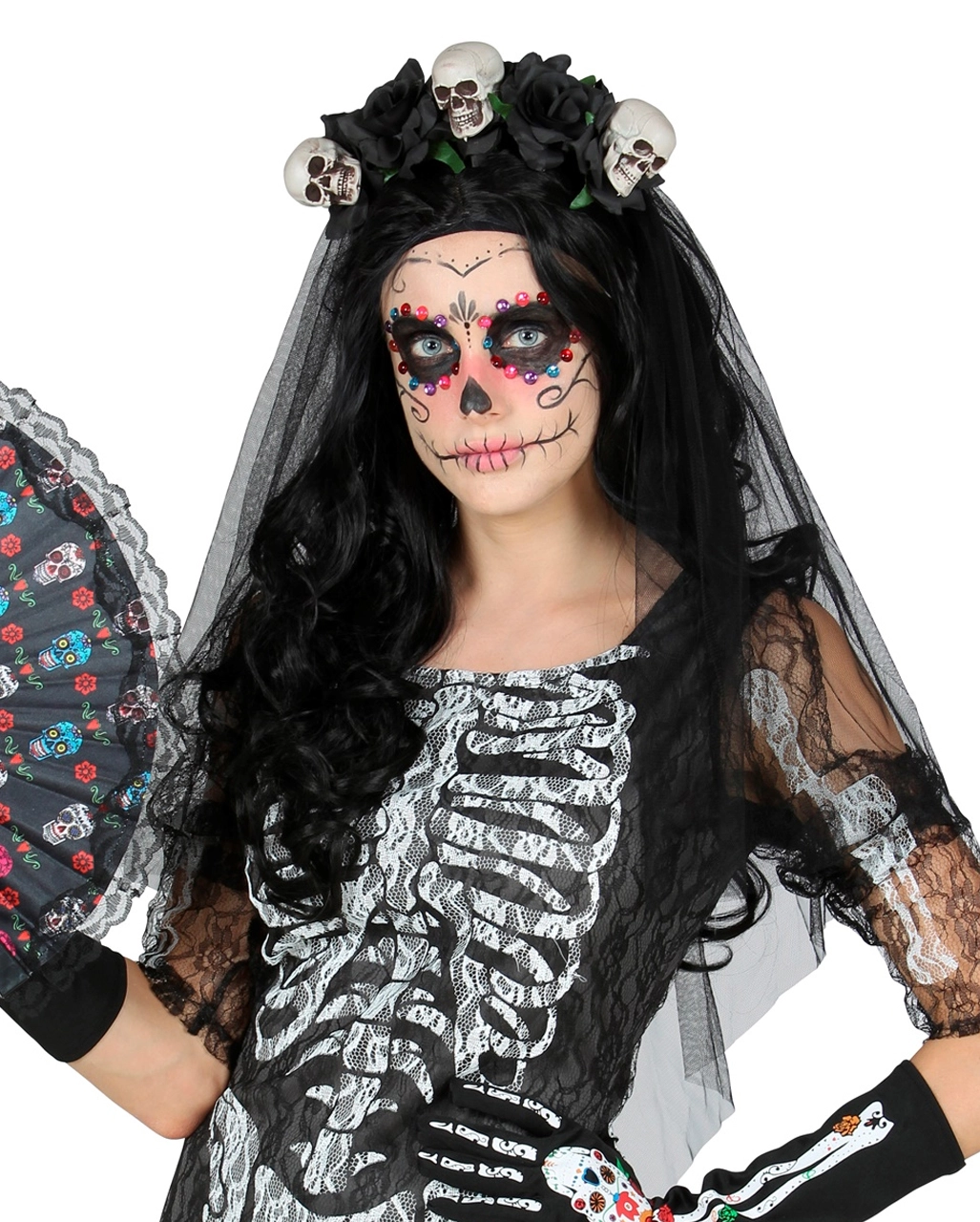 Schwarzer Brautschleier mit Totenschädeln