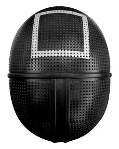 Die Squid Game Maske ist aus schwarzem Kunststoff und besitzt das für sie klassische Viereck. Auf der Rückseite wird die Halbmaske mit einem Gummiband am Kopf gehalten.