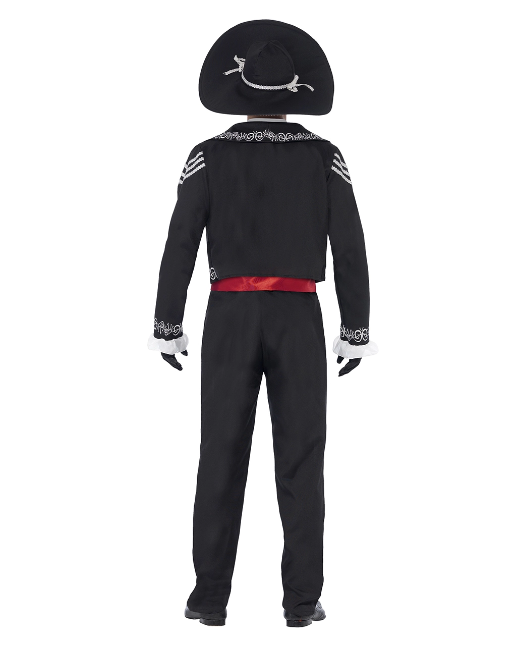 Das Sugar Skull Herren Kostüm ist schwarz-weiß mit roten Highlights. Die Skelett Männer Verkleidung wird geliefert mit einem Mexiko-Hut der mit Silberbordüren umrandet und auf der Unterseite mit typischen Skelett-Teilen bedruckt ist auch um den Kopf herum hat er eine silberne Borte & zwei Schleifen. Das Sugar Skull Herren Kostüm beinhaltet noch ein ärmelloses Hemd mit weißem Kragen, das man am Nacken mit einem Klettverschluss schließen kann, mit 3 weißen Knöpfen aus Kunststoff, einer Fliege & ein rotes Satinband, das aussieht wie ein Hüftgürtel, der das Hemd abschließt. Die Hose, das Hemd, die Fliege & die Jacke sind wie der Sombrero mit weißen Knochenteilen bedruckt, die Rückseite ist schwarz. Die langärmelige Jacke des Kostüms hat weiße Rüschen angenäht & auf der Brust klebt eine rote Bräutigam-Rose. Die Schultern der Sugar Skull Jacke sind mit 3 silbernen Bordüren geziert. Mit den Einbrecher Handschuhe Extra Groß und dem Family Skelett Make Up Set ist das Tag der Toten-Kostüm ein Faschings Hit!
