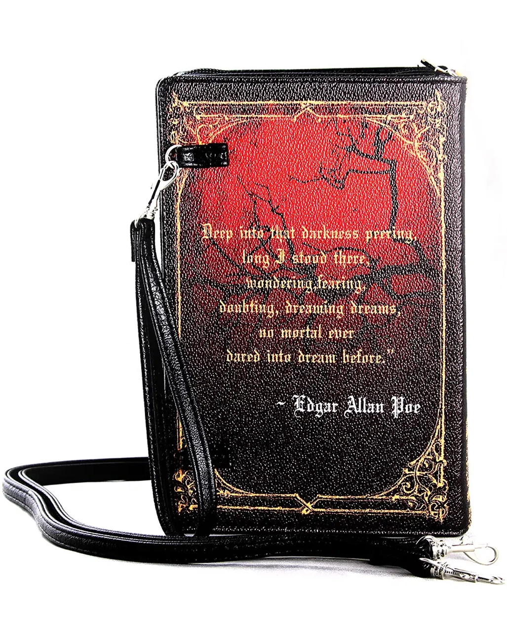 Manche düstere Legenden sind einfach zu schade, als dass man sie nicht permanent mit sich herumtragen möchte. So wie unsere geniale The Raven Buch Handtasche. Die Gothic Schultertasche ist das ideale Mode Accessoire für Fans des legendären Horror Autors Edgar Allen Poe, der vor allem durch seinen „Raben“ bekannt wurde. Diese wunderbare Stück Literaturgeschichte diente als Inspiration für die Gothic Handtasche in Buch Form, die durch ihren Vintage Look zu einem schaurigen Gesamtkunstwerk der Mode wird.